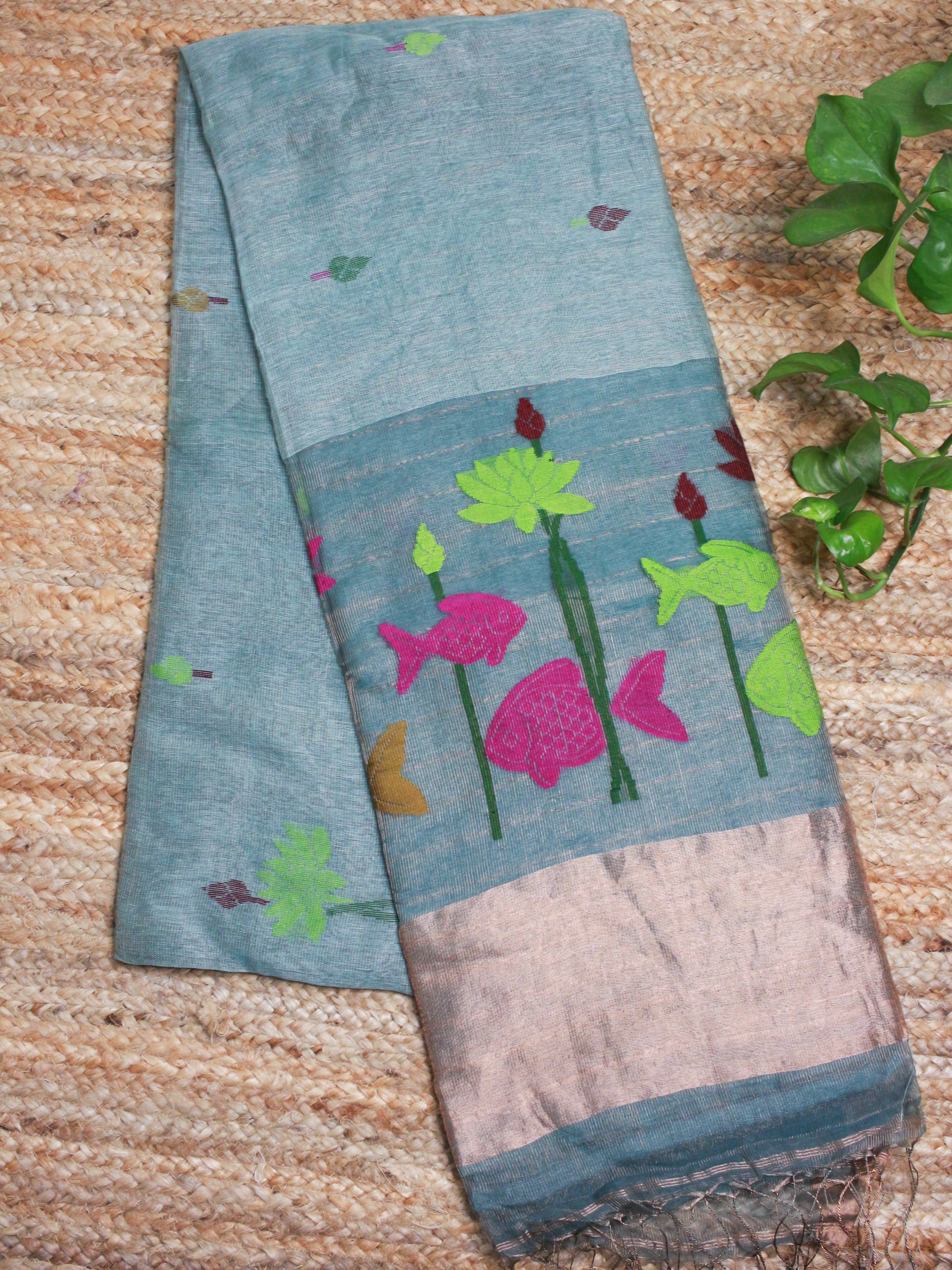 Aqua Blue Pure Linen Saree with Muslin Pallu – Fish & Lotus Motif, Gold Zari Accents