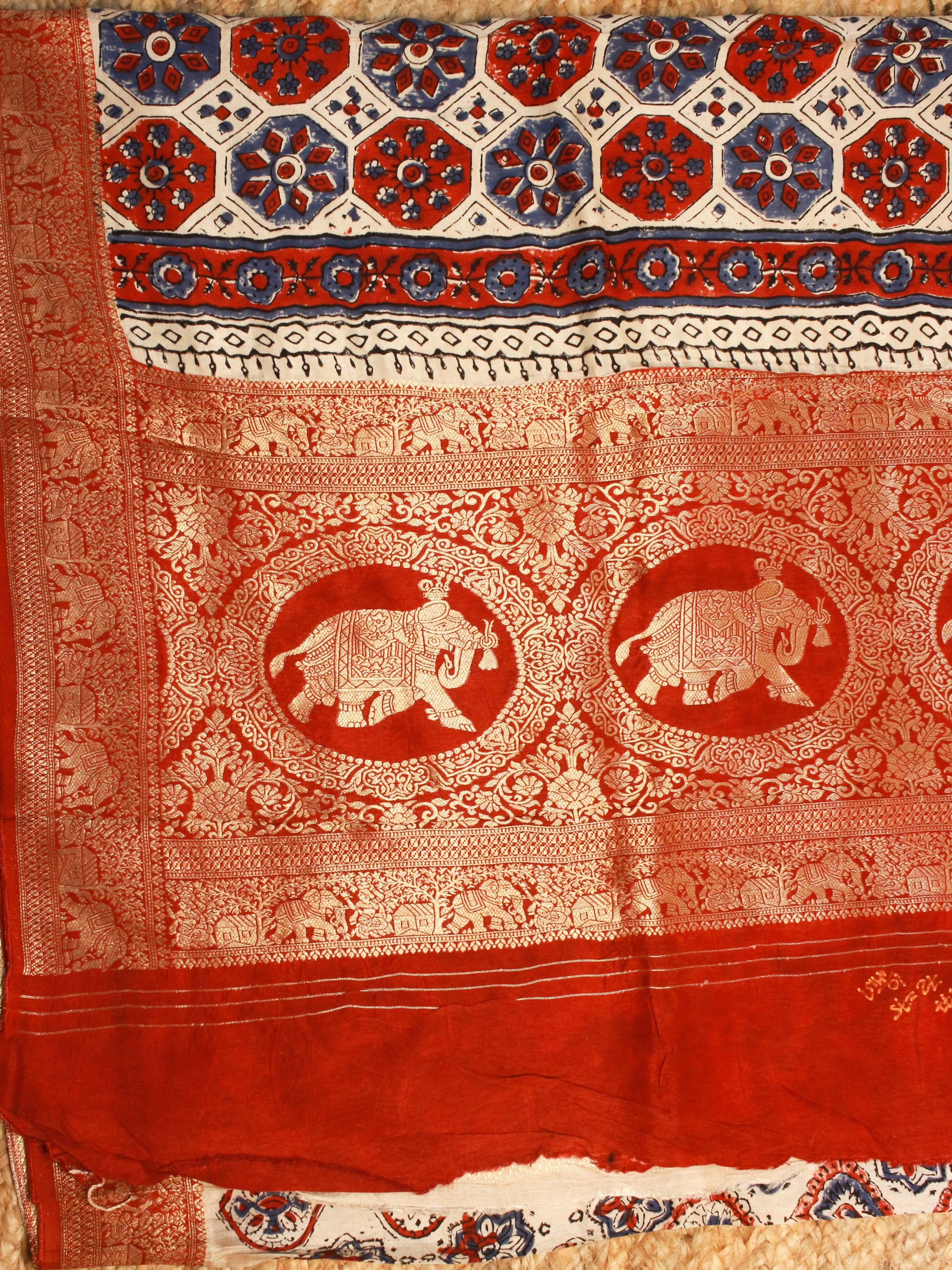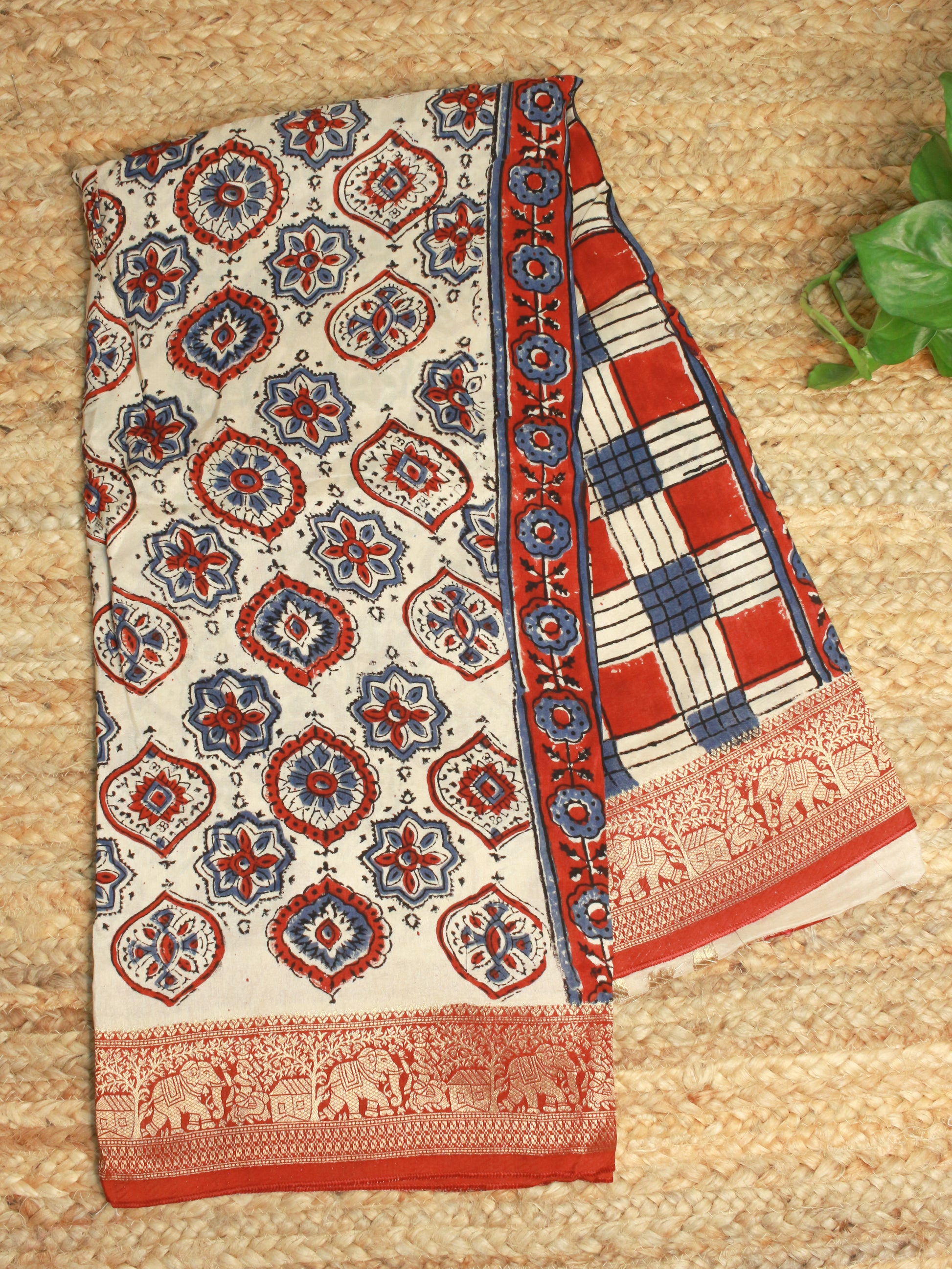 Beige Hand Block Print pure Dola Silk Saree with brick red traditional flower motifs-Golden Elephant Zari Border