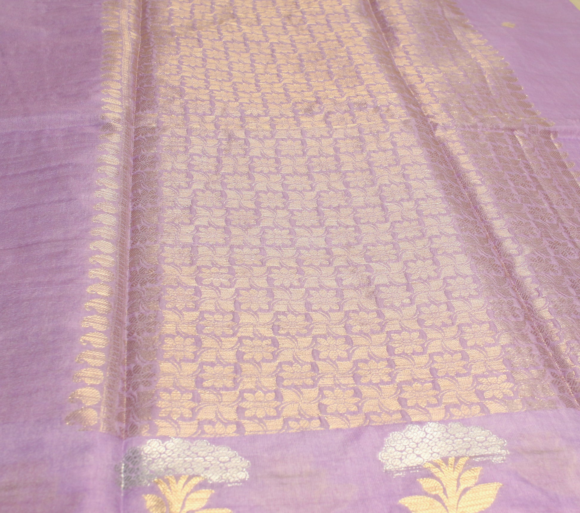 Classic Lavender Banarasi semi raw mango Saree with silver and gold Zari Floral Buttas