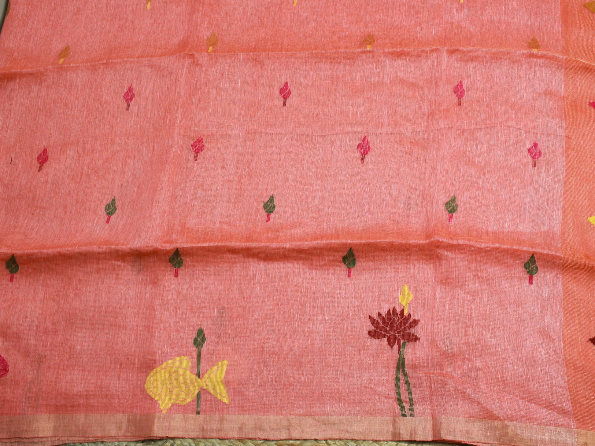 Coral Pink Pure Linen Saree with Muslin Pallu – Fish & Lotus Motif, Gold Zari Accents