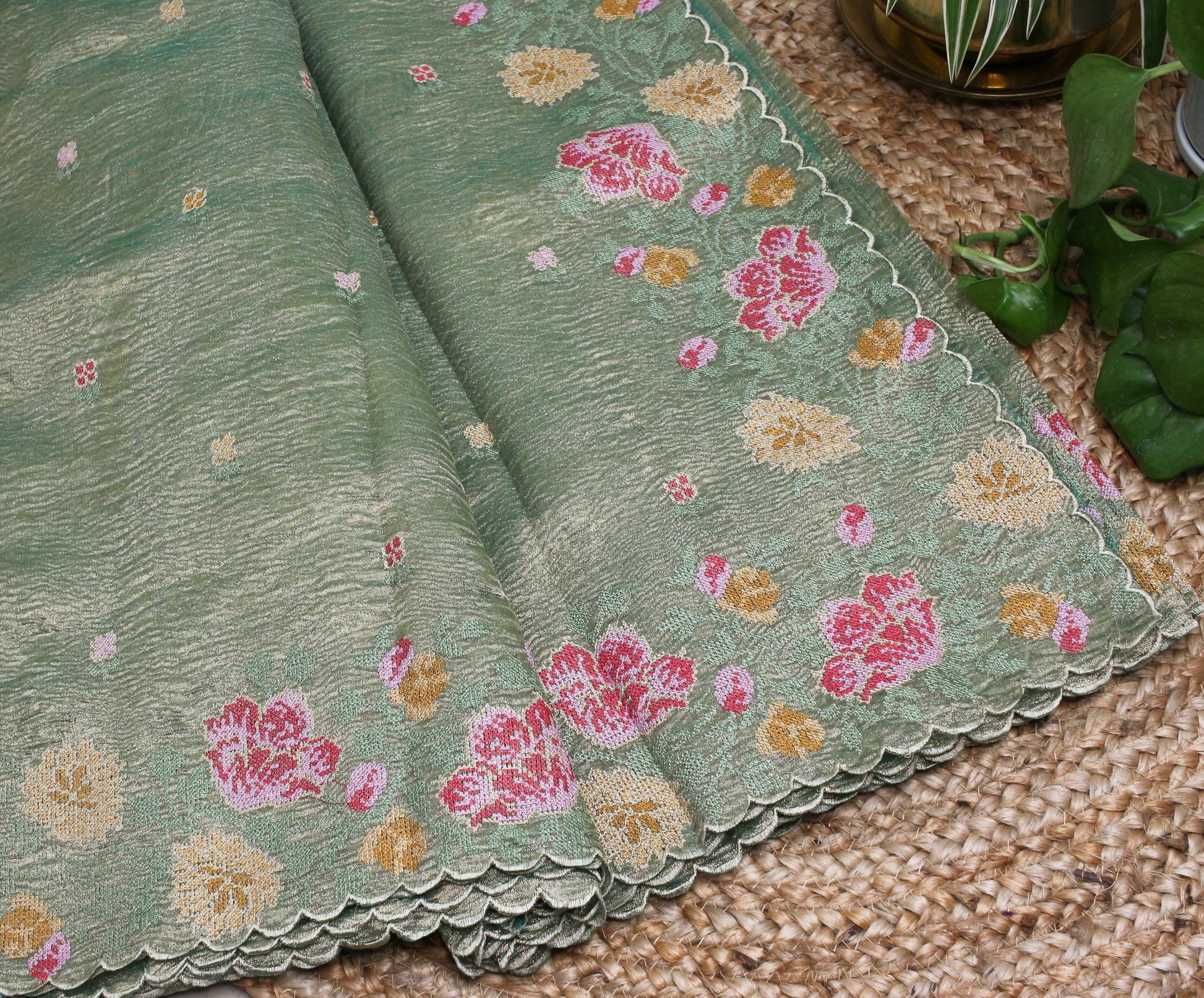 Elevate your ethnic wardrobe with this exquisite Bottle green Gold Crush Tissue Saree, designed to radiate timeless grace and sophistication. Crafted from luxurious crush tissue fabric, this saree features a soft sheen that beautifully catches the light. The delicate floral embroidery in shades of pink, yellow, and green adds a romantic charm, especially around the scalloped border. Perfect for festive occasions, weddings, or intimate gatherings, this saree blends tradition with elegance. Pair it with a contrasting or matching blouse to complete the look.