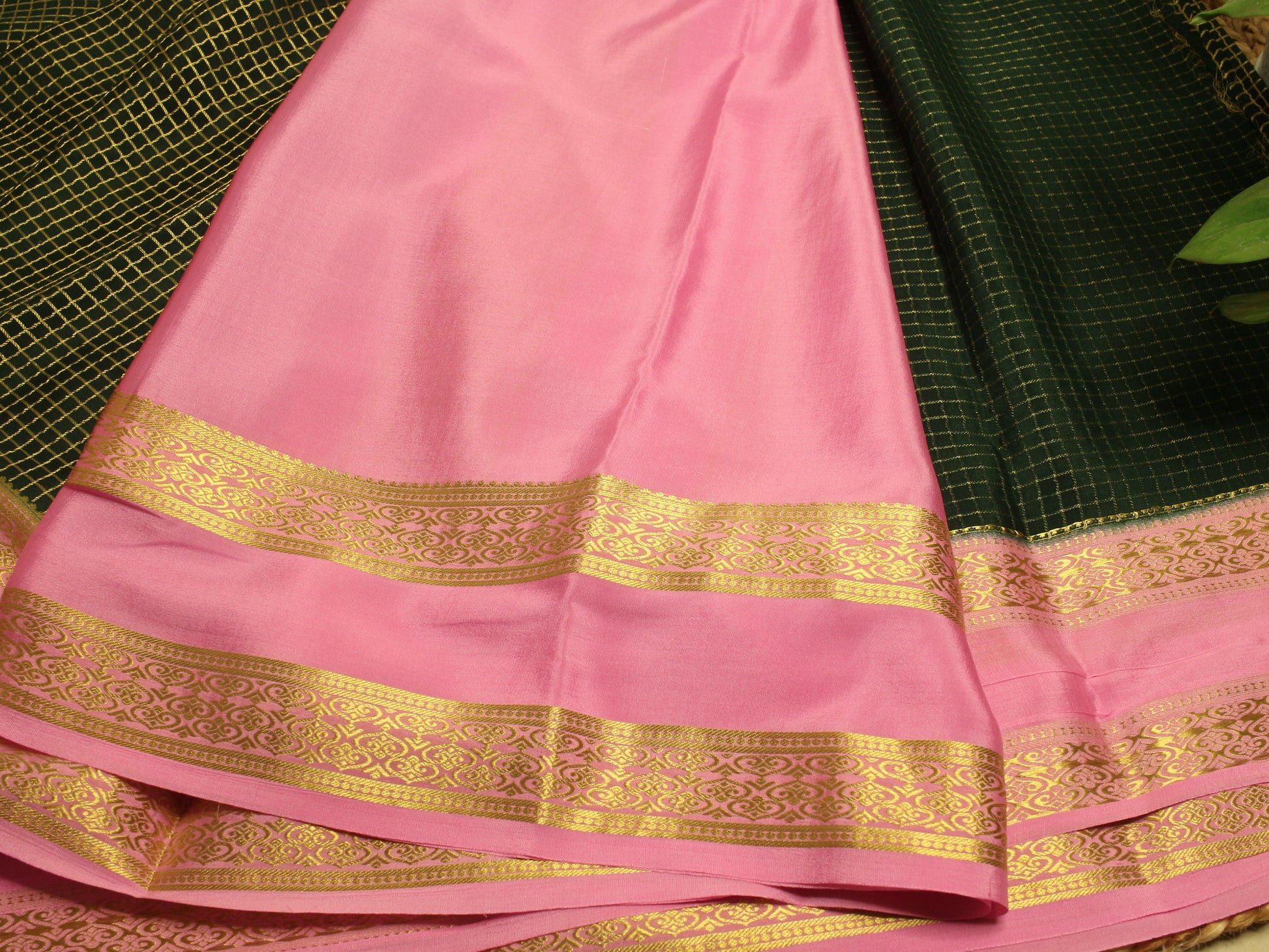 Mysore Silk Crepe Saree, featuring a deep bottle green body embellished with gold zari checks. The rich contrast baby pink border and pallu with intricate golden zari patterns.