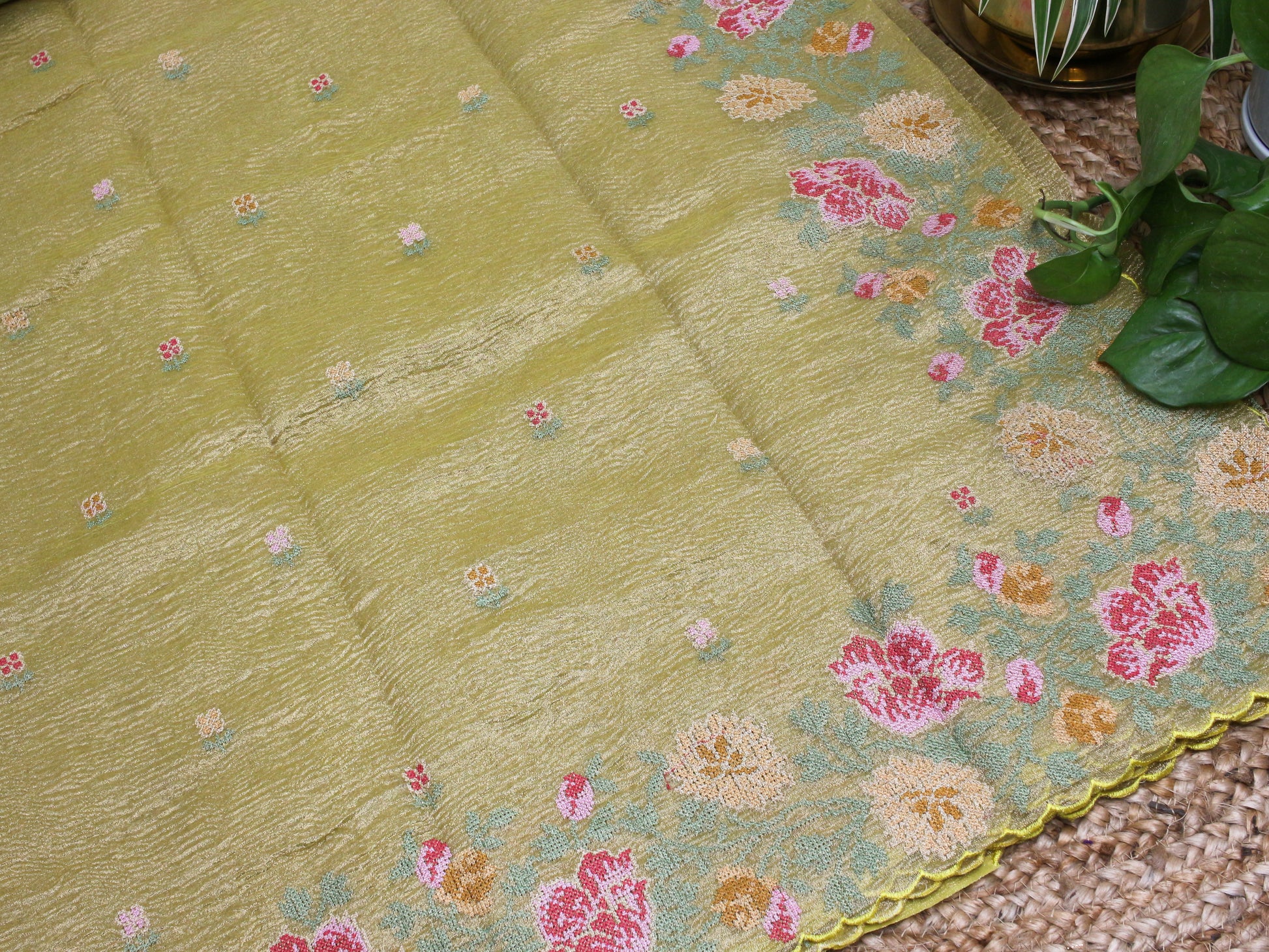 Elegant greenish yellow Gold Crush Tissue Saree with Floral Embroidery