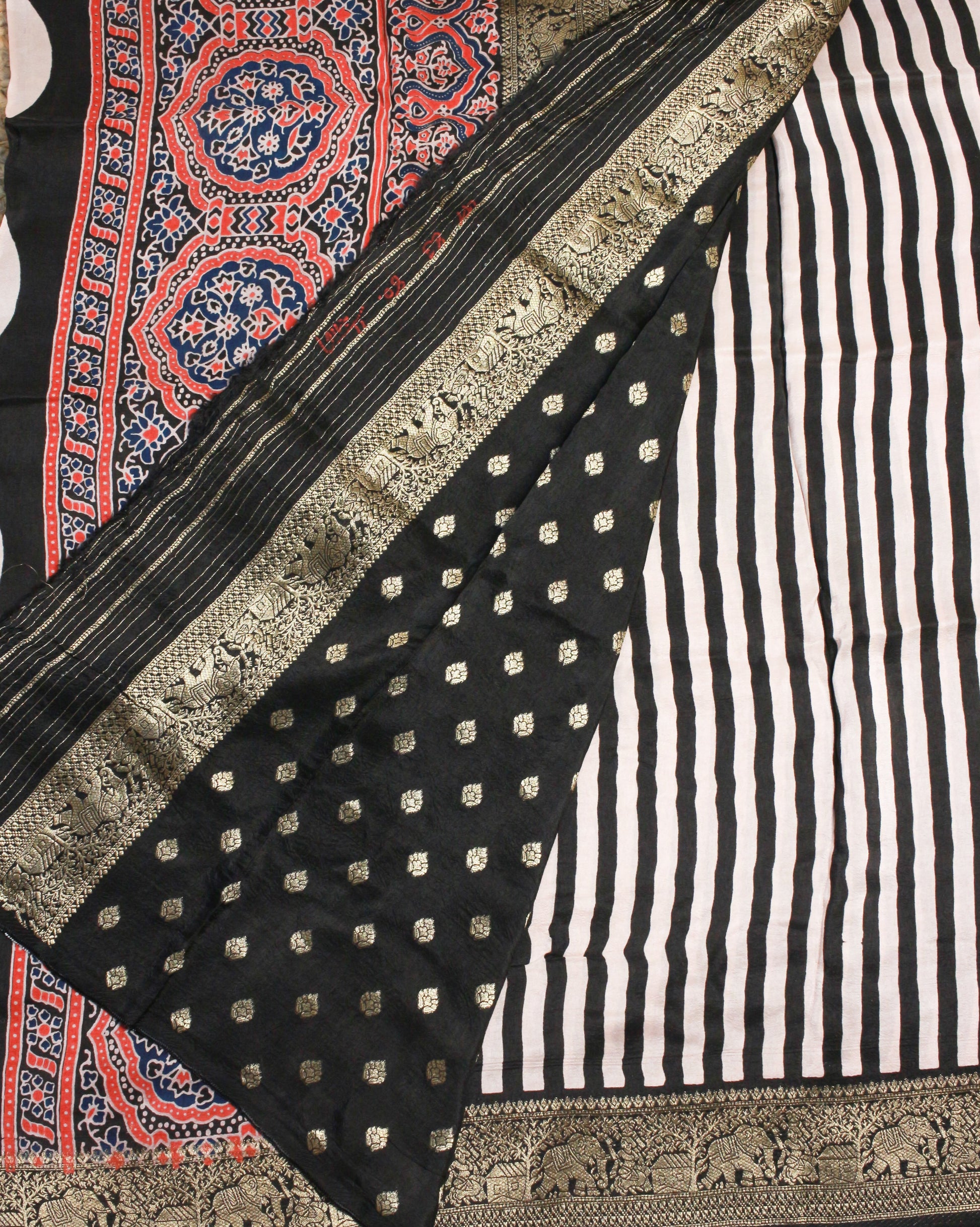 Elegant Black stripes hand Block Ajrakh Print pure Dola Silk Saree with Golden Elephant Border & Pallu