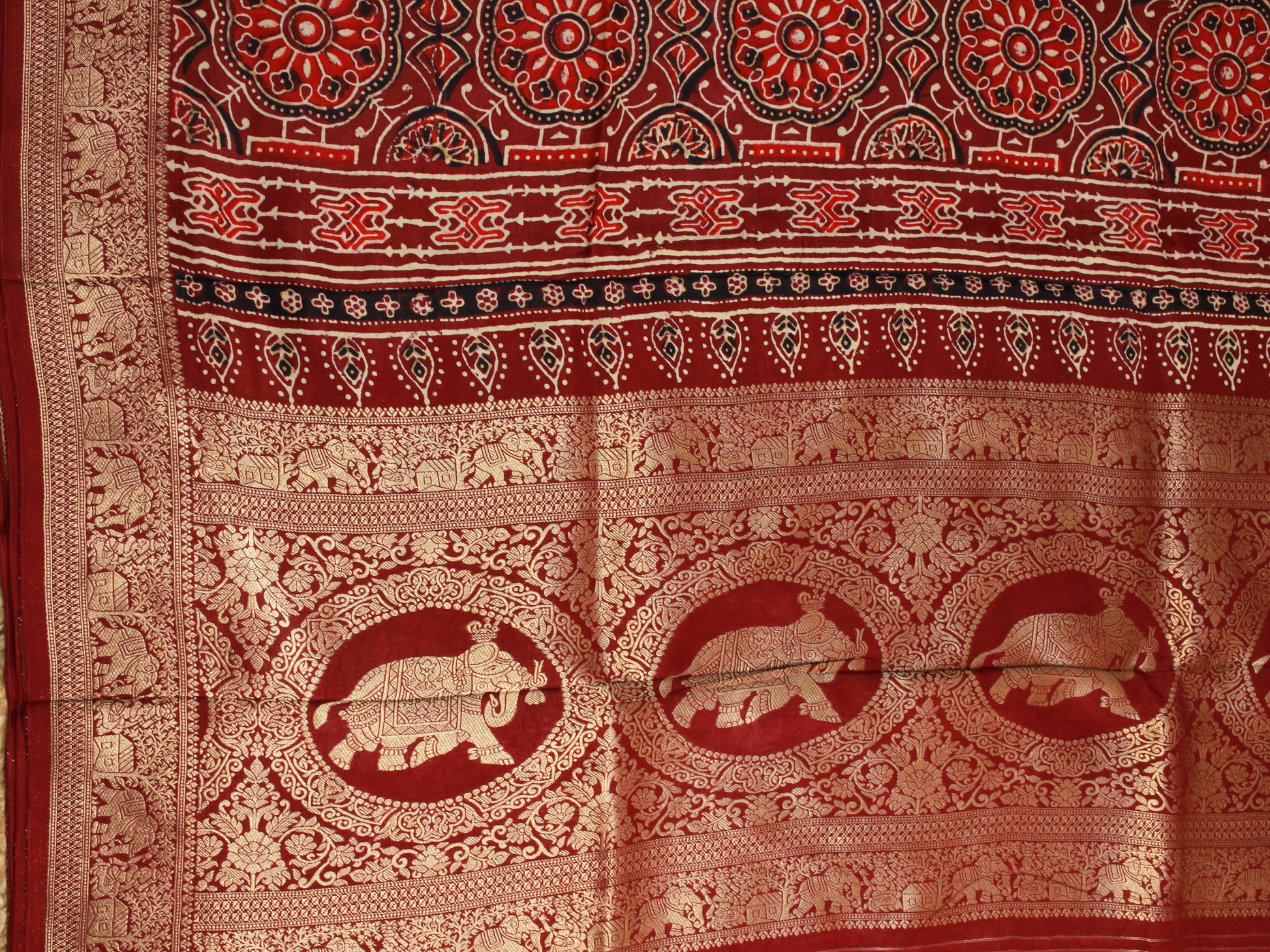 Elegant Maroon and Black stripes hand Block Ajrakh Print pure Dola Silk Saree with Golden Elephant Border & Pallu
