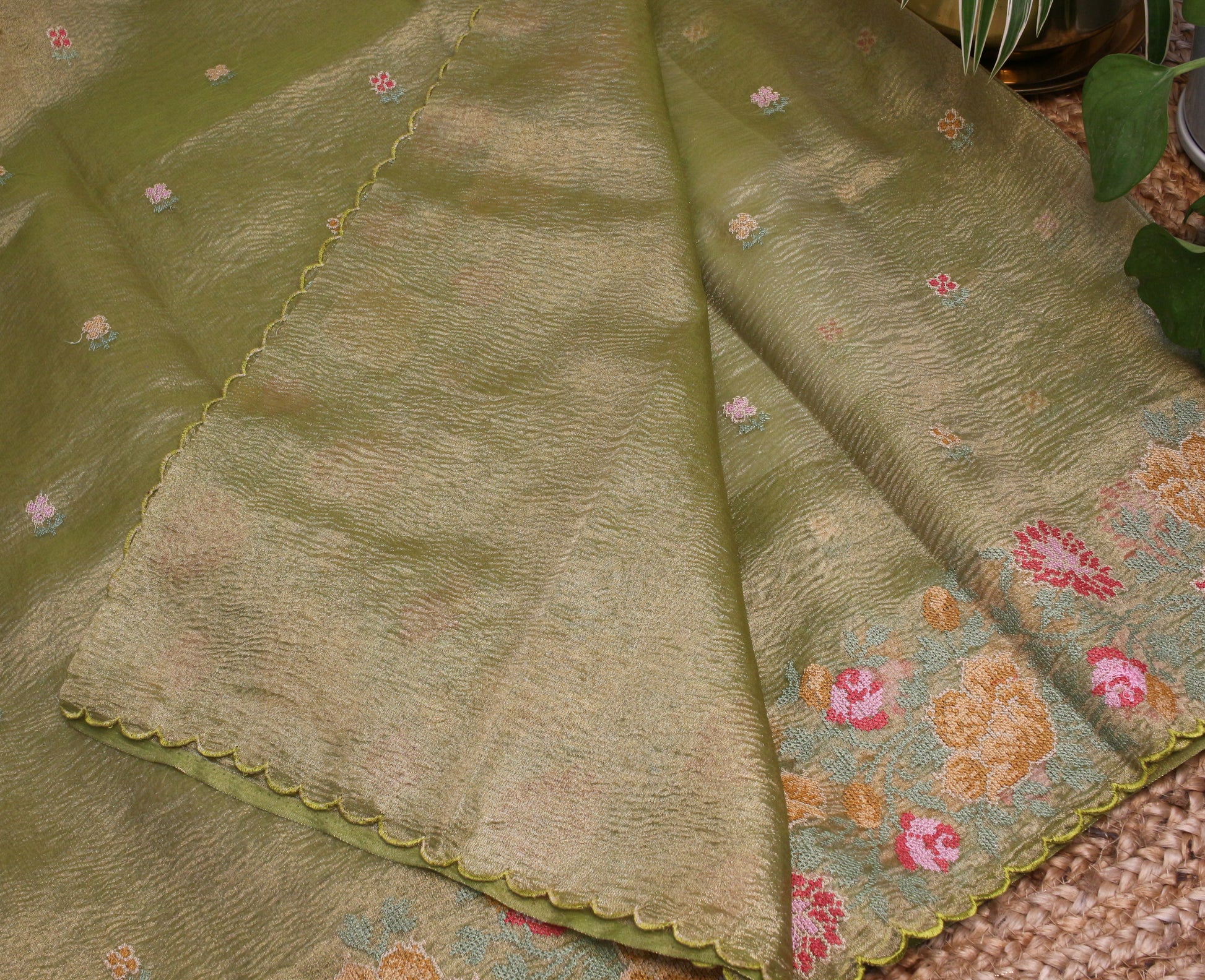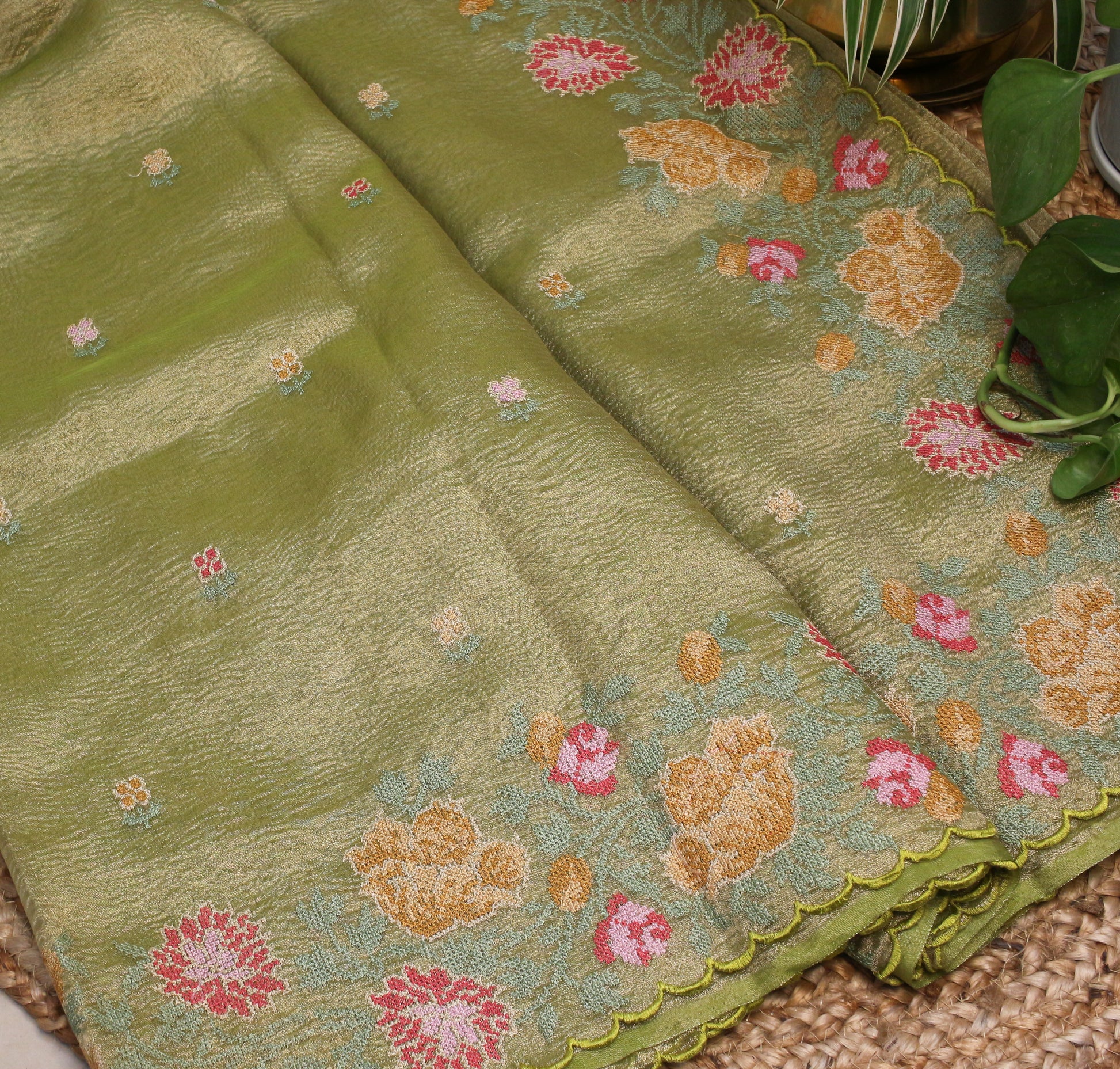 Elegant parrot green Gold Crush Tissue Saree with Floral Embroidery