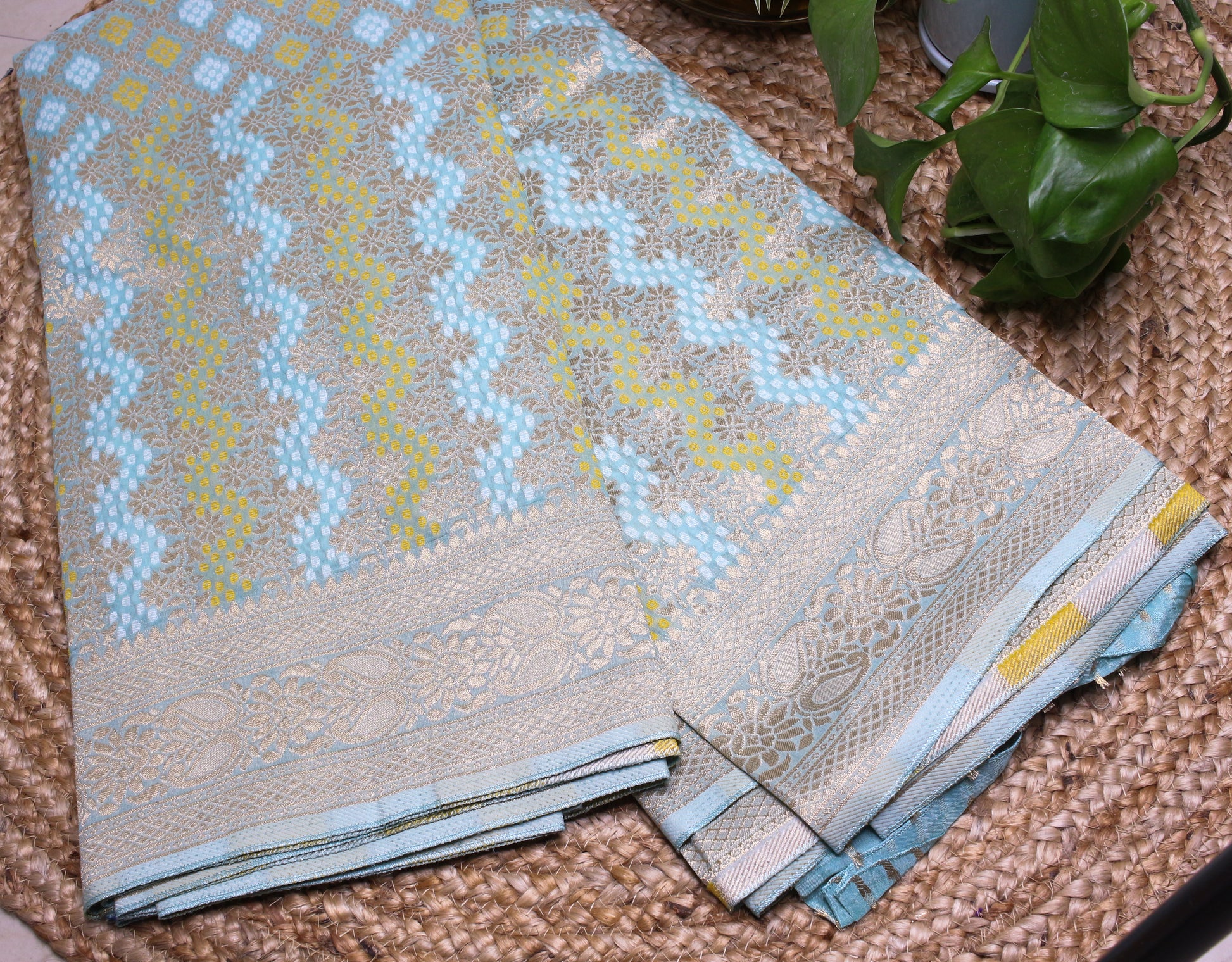 Experience the perfect blend of tradition and comfort with this stunning Sky Blue Banarasi Semi-Georgette Saree, adorned with intricate gold zari weaving. Crafted from premium semi-georgette fabric, this saree offers a breathable drape while capturing the opulence of classic Banarasi artistry.