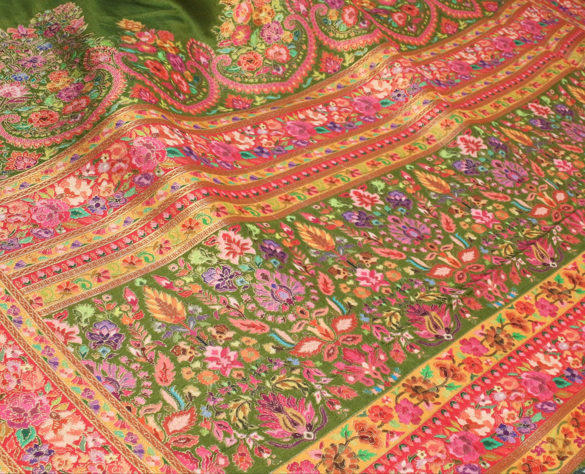 Experience the artistry of Kashmir with this exquisite Henna green Kanni silk saree, a tribute to traditional craftsmanship and opulence. This saree features a stunning floral jaal in vivid hues of pink, orange, green, and magenta, gracefully adorning the border and pallu. The luxurious silk fabric drapes elegantly, making it perfect for weddings, grand festivities.