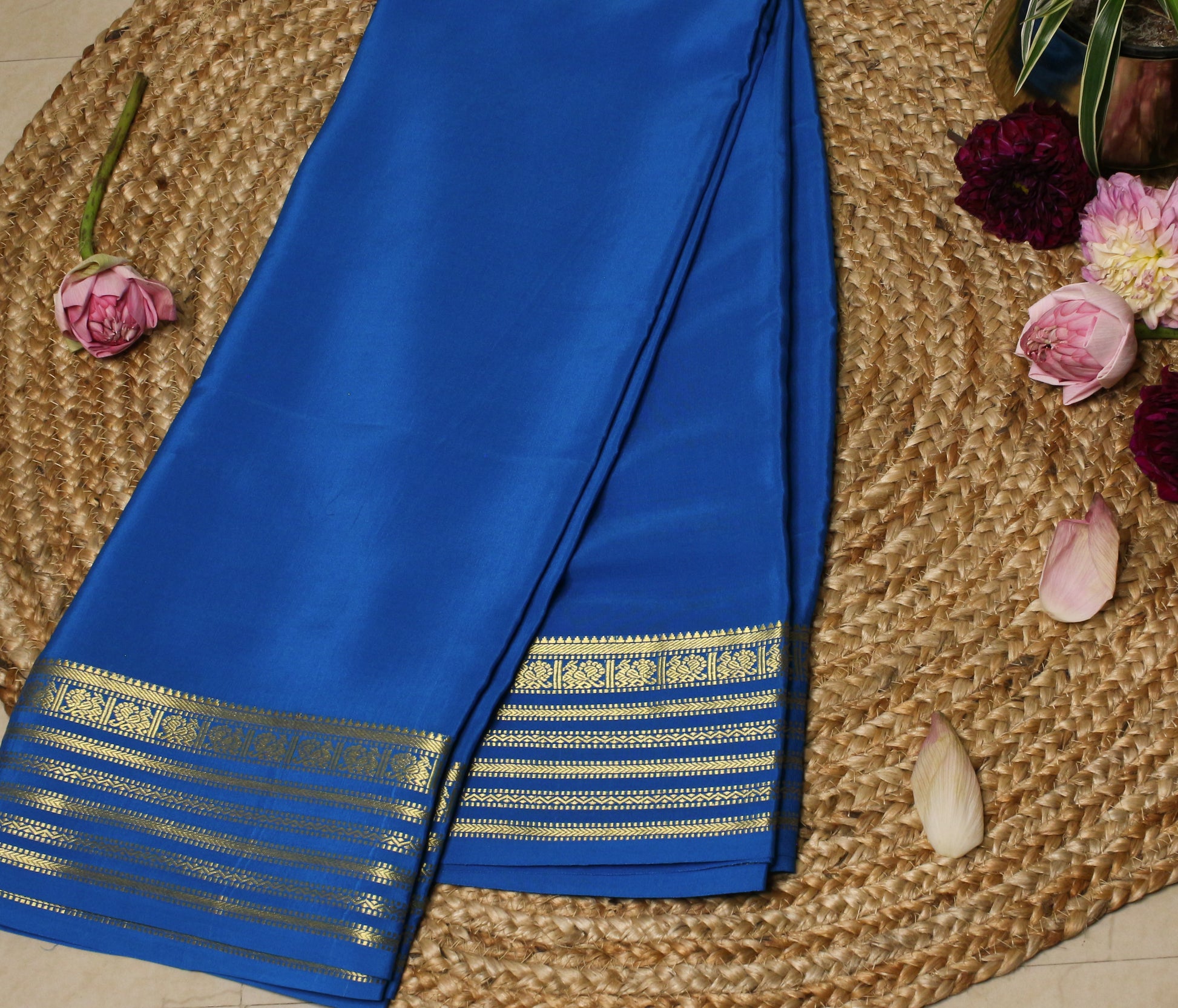 Kerosene Blue Mysore Silk Crepe Saree with Gold Zari Striped Border