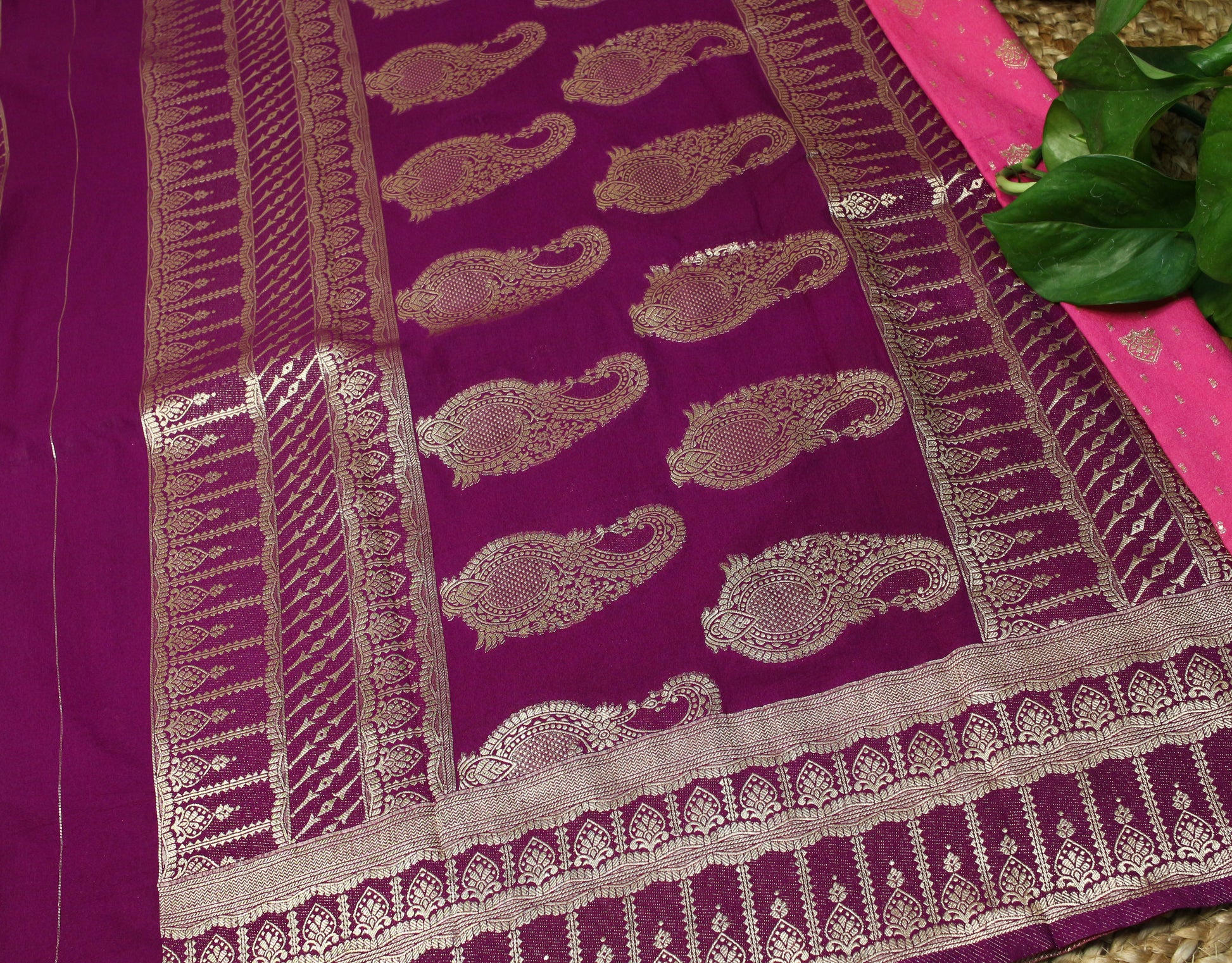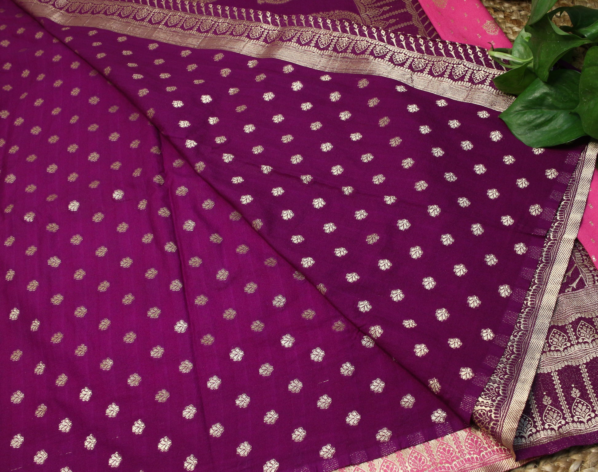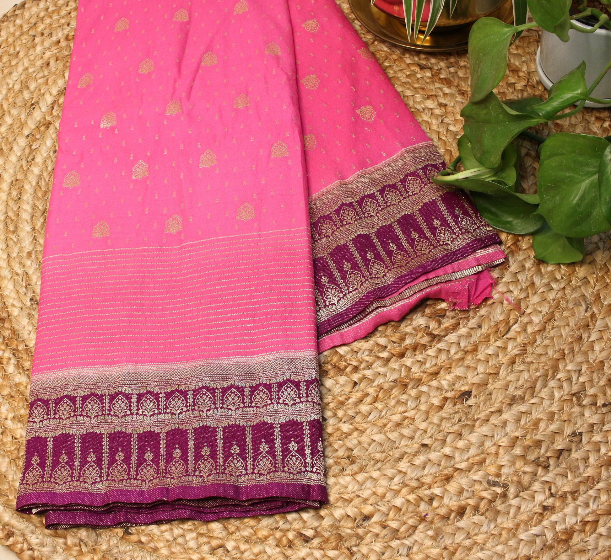 Drape yourself in elegance with our exquisite Soft Chinnon Banarasi Saree, crafted to bring out timeless beauty with a modern twist. This stunning saree features a Pink base, adorned with intricate golden zari motifs throughout the body, adding a regal charm to your look. The saree is complemented by a contrasting deep purple zari-woven border with traditional Banarasi patterns.