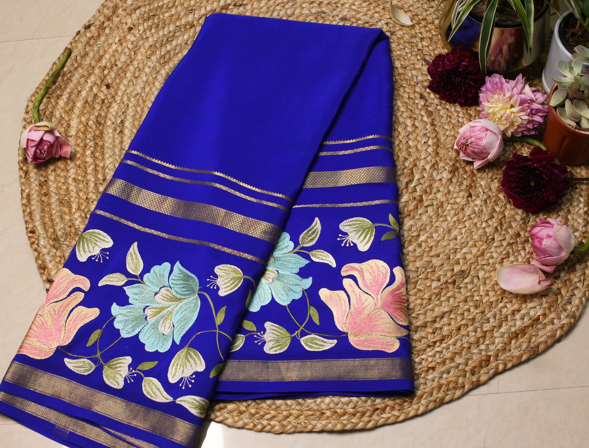 Royal Blue Mysore Silk Crepe Saree with Pastel Floral Embroidery