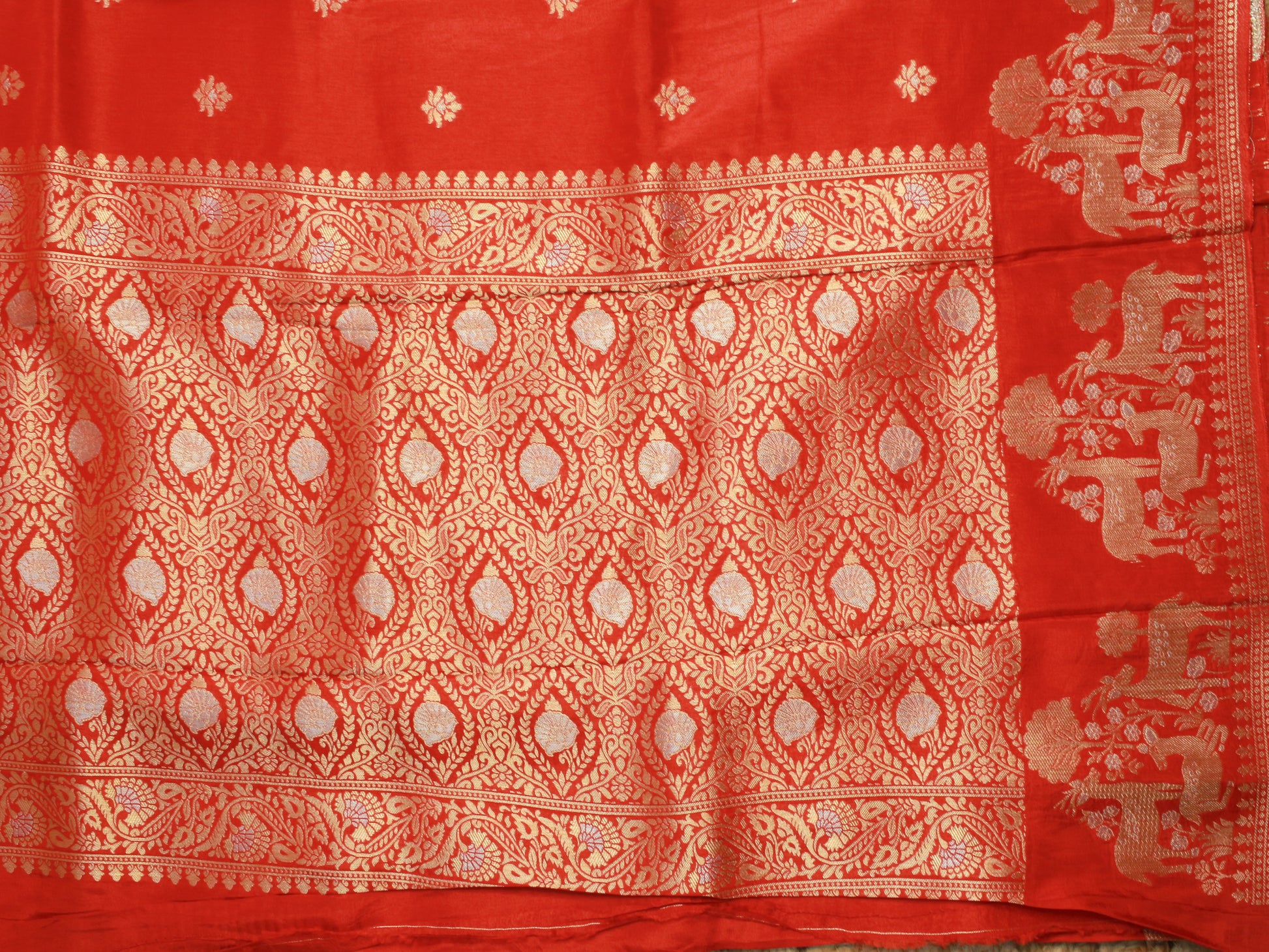 Rust Red Banarasi Russian Silk Saree with Antique Zari Deer Motif Border
