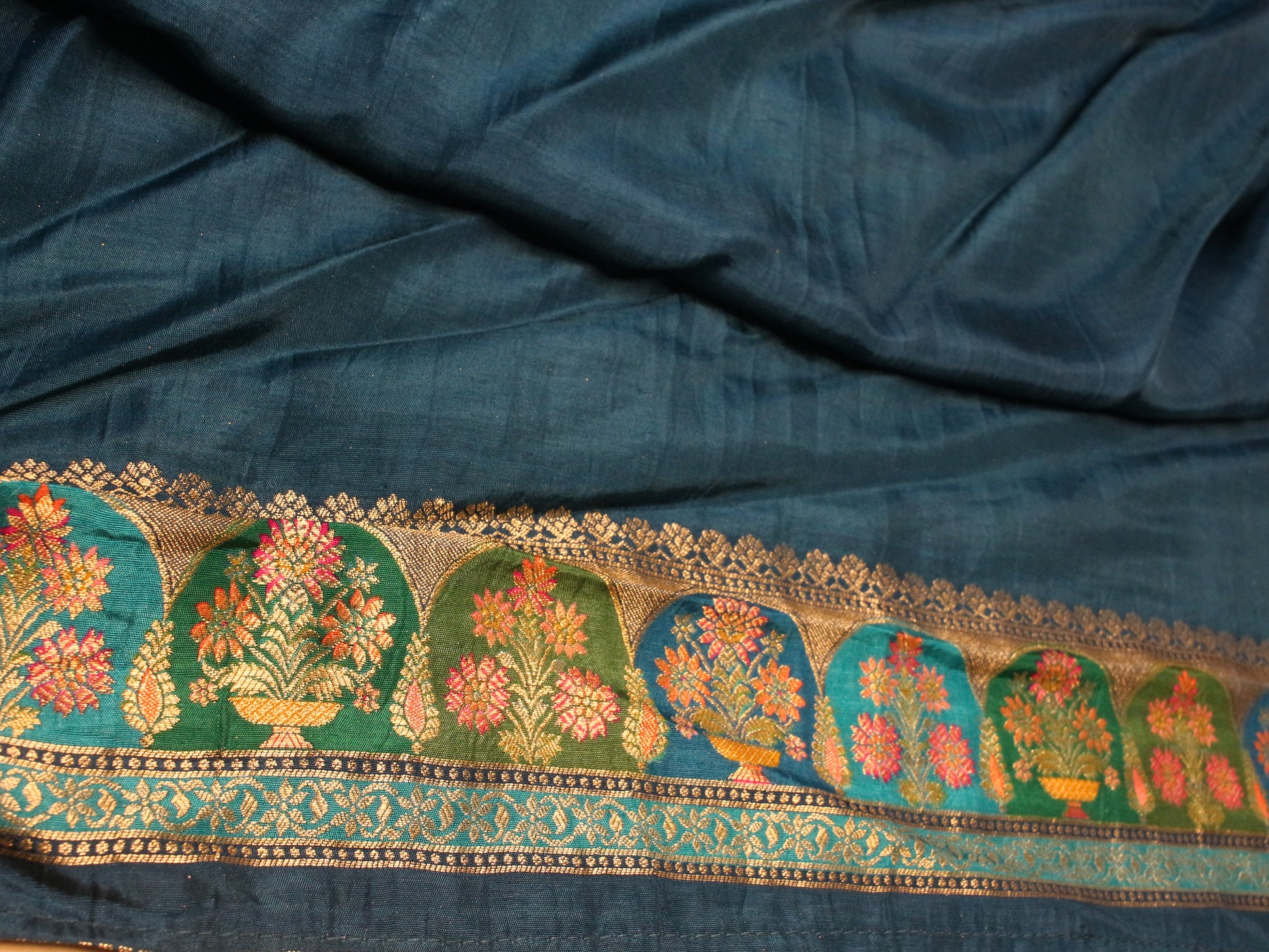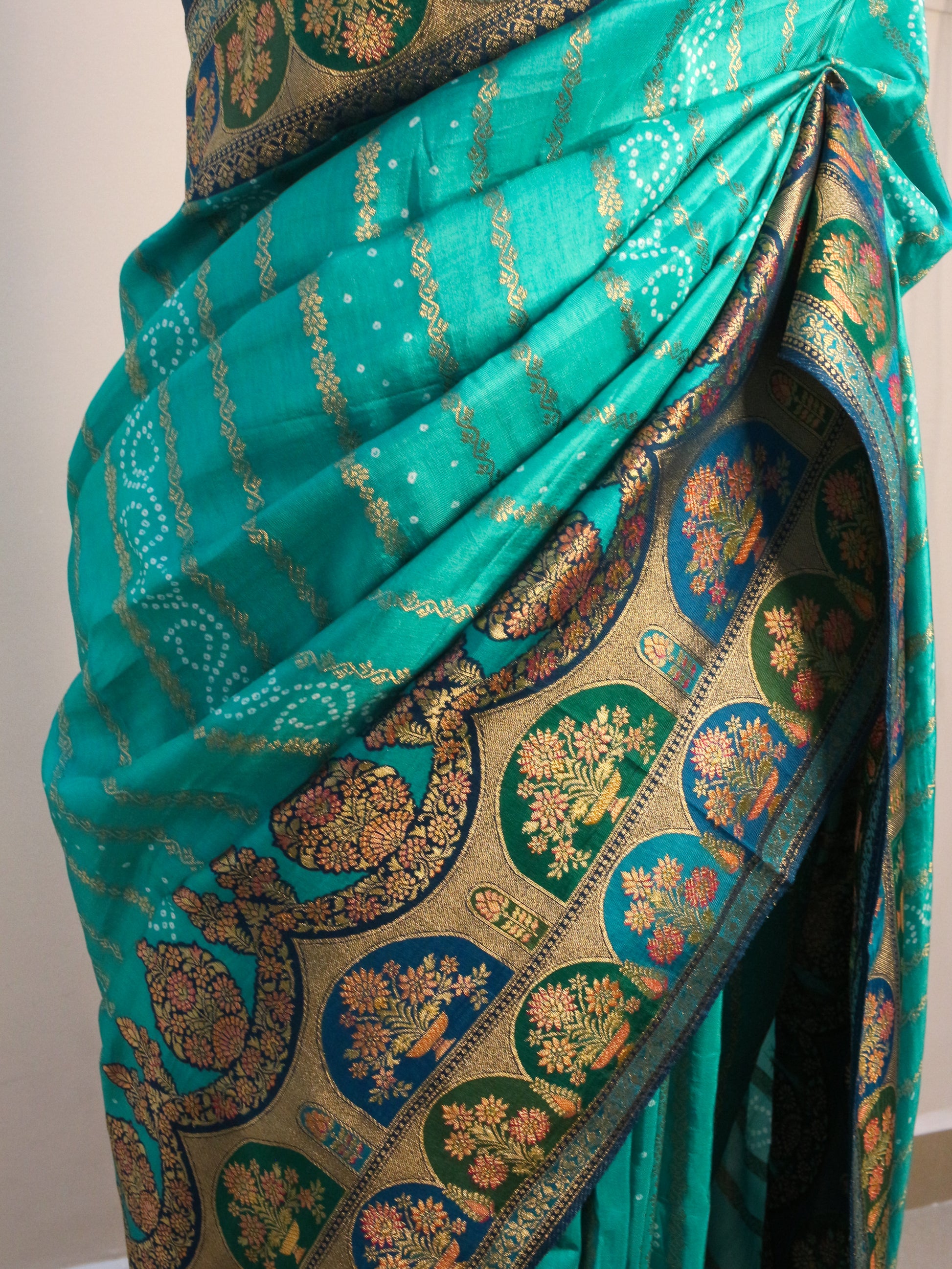 Celebrate tradition with timeless elegance in this breath taking Sea green Kani silk saree featuring classic Bandhani work and rich gold zari detailing. The intricate Bandhani patterns add a delicate texture across the body, while the broad golden zari borders and pallu are adorned with regal floral and paisley motifs. This saree beautifully blends Kashmiri craftsmanship with Rajasthani heritage, making it a perfect choice for weddings, festivals, and grand occasions.